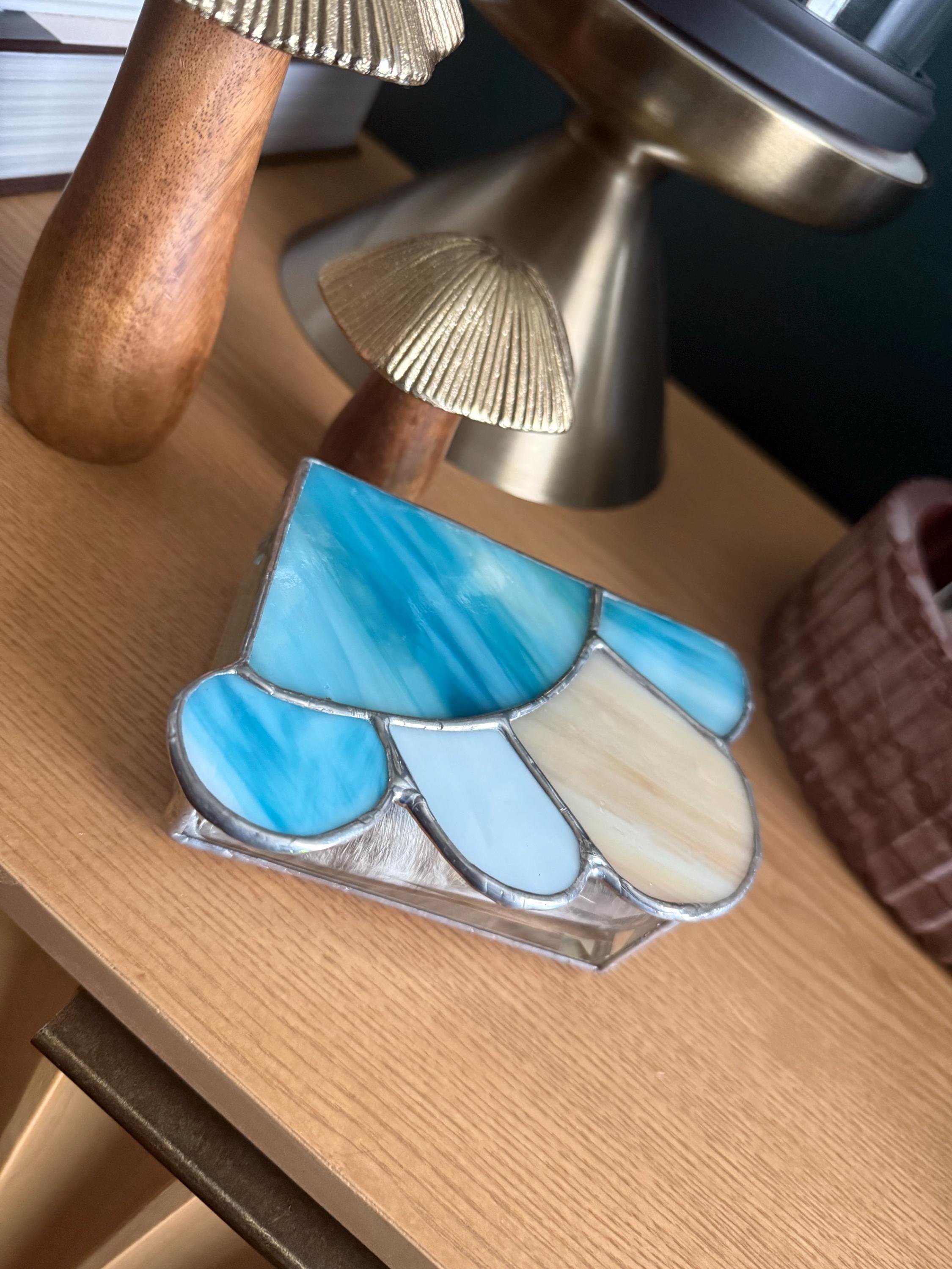 This pretty little stained glass box created with a variety of turquoise, pale golden brown and a blend of turquoise and tan stained glass. Each piece of glass is different in color and texture but all blend together in a brilliant bright beach-ish kind of way.